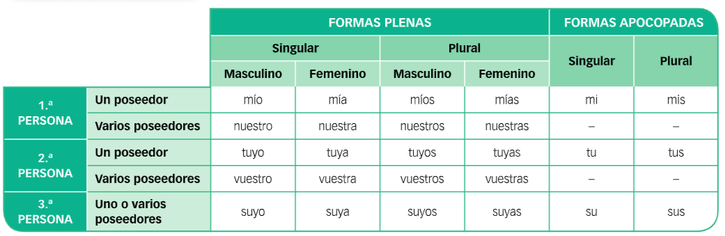 - Determinantes: palabras que acompañan al sustantivo para concretarlo, determinarlo y aportar información sobre el mismo, (género, número, situación en el espacio o posesión). Por ejemplo la, el, mi, tu, nuestro, vuestras...